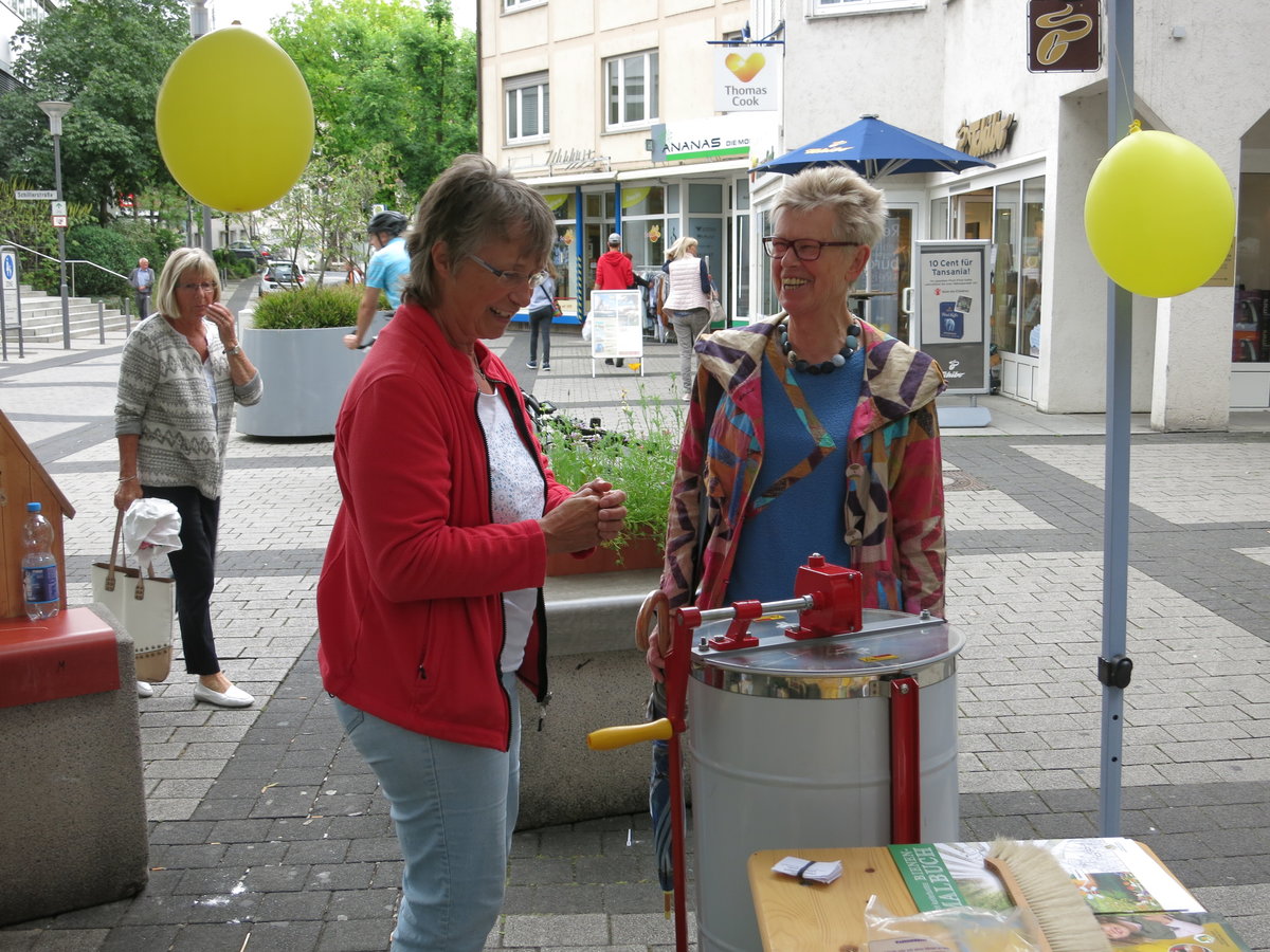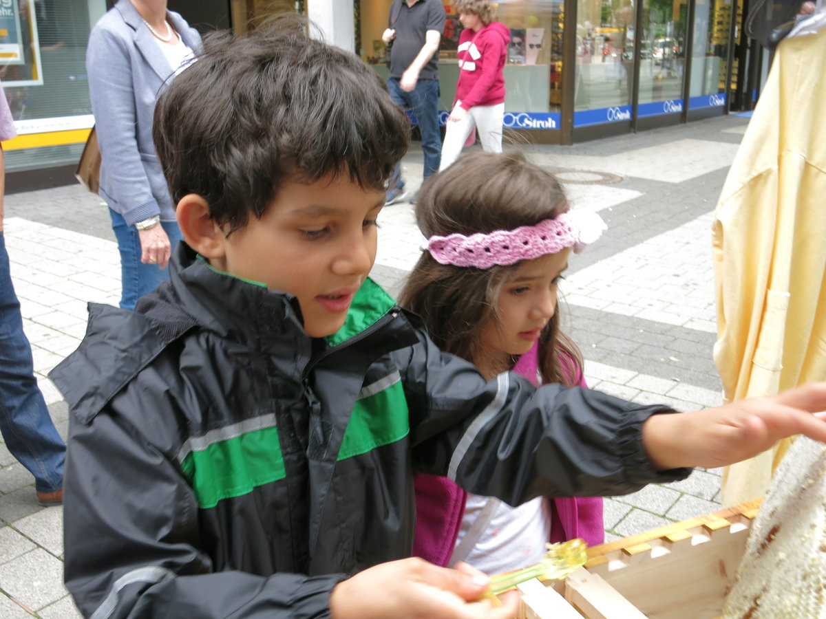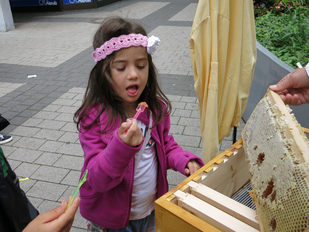 Nette Begegnungen und Gespräche beim Tag der Deutschen Imkerei am 1. Juli 2017 – unsere kleine Imkerei in der Backnanger Innenstadt war sehr gut besucht. Mehrere Sorten Honig konnten probiert werden, auch direkt aus der Wabe. Viele Besucher waren erstaunlich gut informiert, manche haben oder hatten selbst schon Imker in der Familie oder möchten vielleicht bald auch Bienen halten. Das bescheidene Wetter störte da kaum.