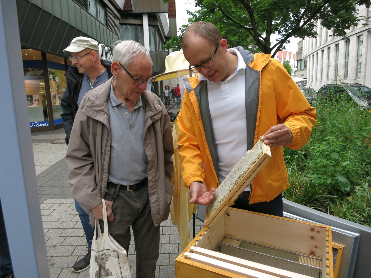 Nette Begegnungen und Gespräche beim Tag der Deutschen Imkerei am 1. Juli 2017 – unsere kleine Imkerei in der Backnanger Innenstadt war sehr gut besucht. Mehrere Sorten Honig konnten probiert werden, auch direkt aus der Wabe. Viele Besucher waren erstaunlich gut informiert, manche haben oder hatten selbst schon Imker in der Familie oder möchten vielleicht bald auch Bienen halten. Das bescheidene Wetter störte da kaum.
